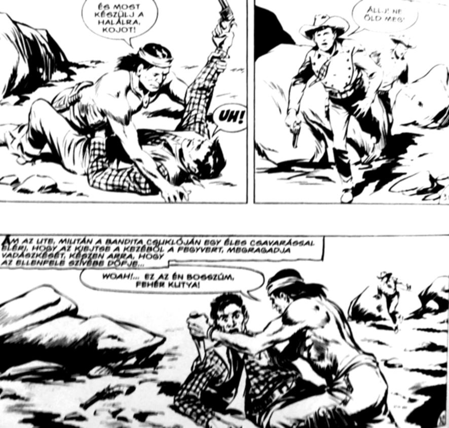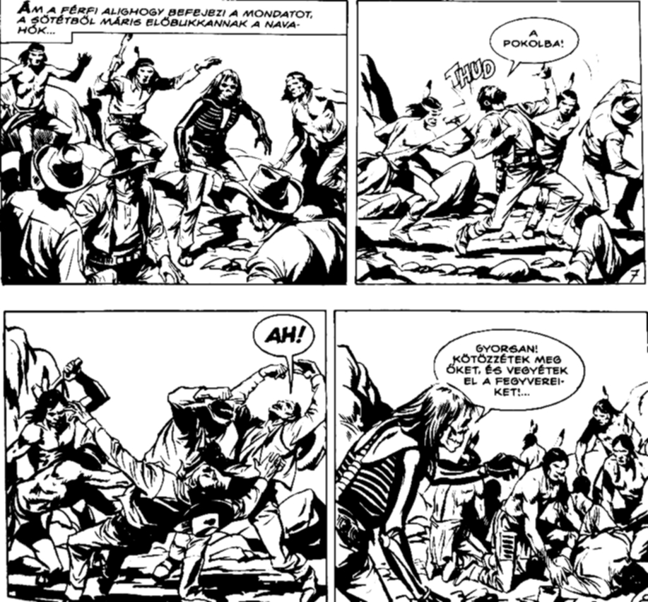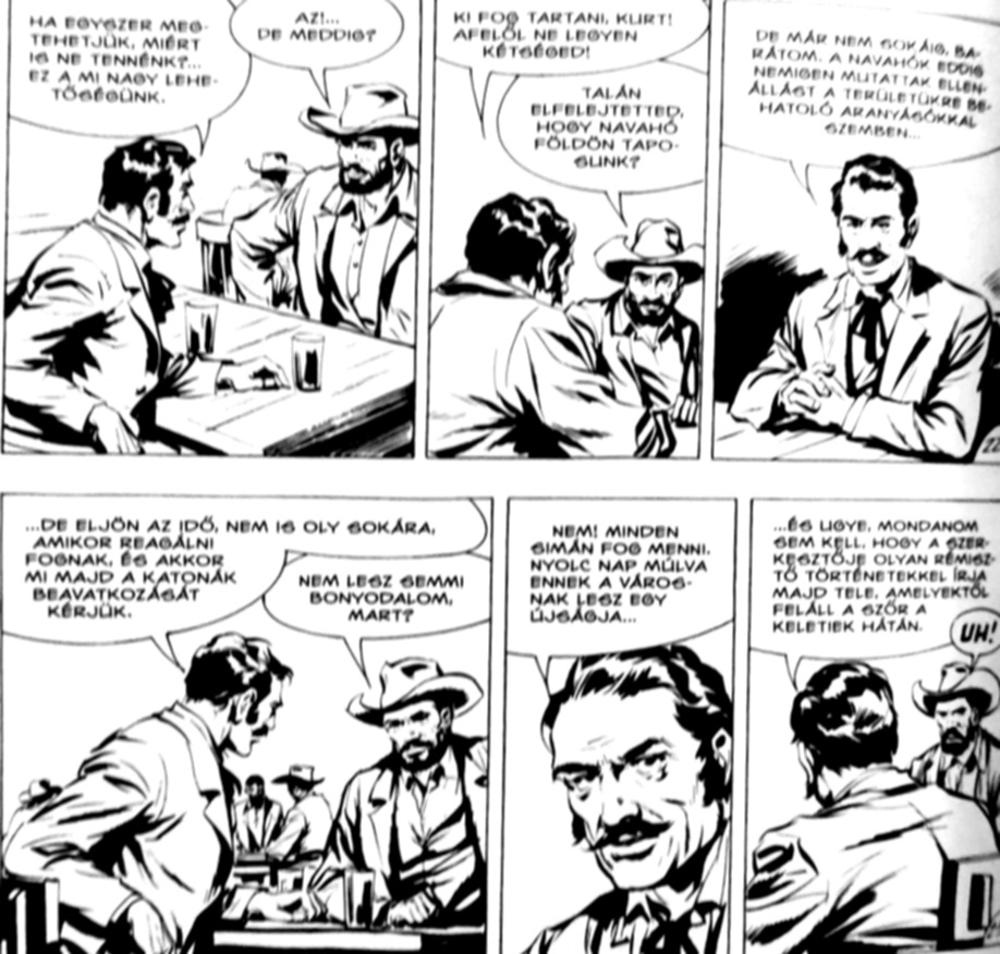 A HE-ról már beszéltem. Illetve a dramaturgiai gyengeségéről. De történet, az indiánok hideg fejű kiszorítása még azokról a területekről is, ahová eleve kiszorították őket, azért volt némileg szívszorító, mert az ember gyereke, ugye. eleve tudja, hogy Tex és a navahók győzelme nagyon átmeneti, az indiánok végül mintegy megtűrtek lesznek a saját hazájukban. (Mondjuk Európa nyugati része szép lassan ugyanezt átélheti a muszlimoktól.)