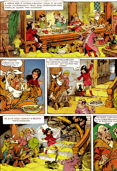 A szöveg öszvér. A leíró, magyarázó részek prózában vannak. Ööö... jobbára. Kivéve a gyevi bírót. A párbeszédbuborékok többynire versesek. De ahol rímel, a szöveg ott sincsen versbe szedve: folyamatos. Csak feltűnik, hogy már megint rímel. De a rímek minősége nem állandó. Van, ahol rettentő nyögvenyelős, van, ahol Romhányi simán bevállalná a sajátjának.