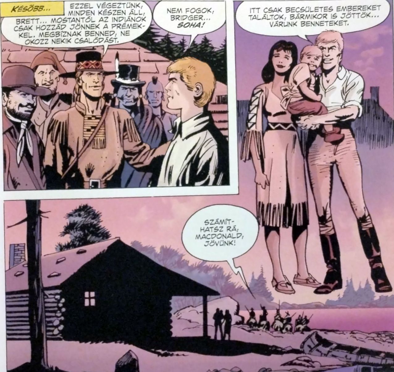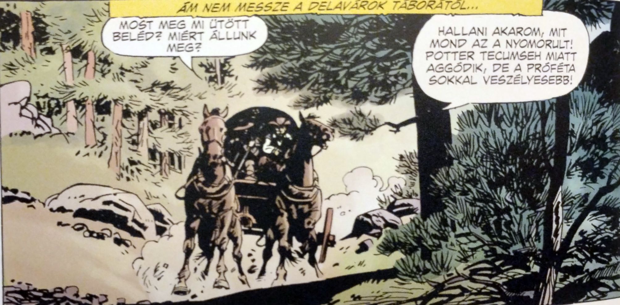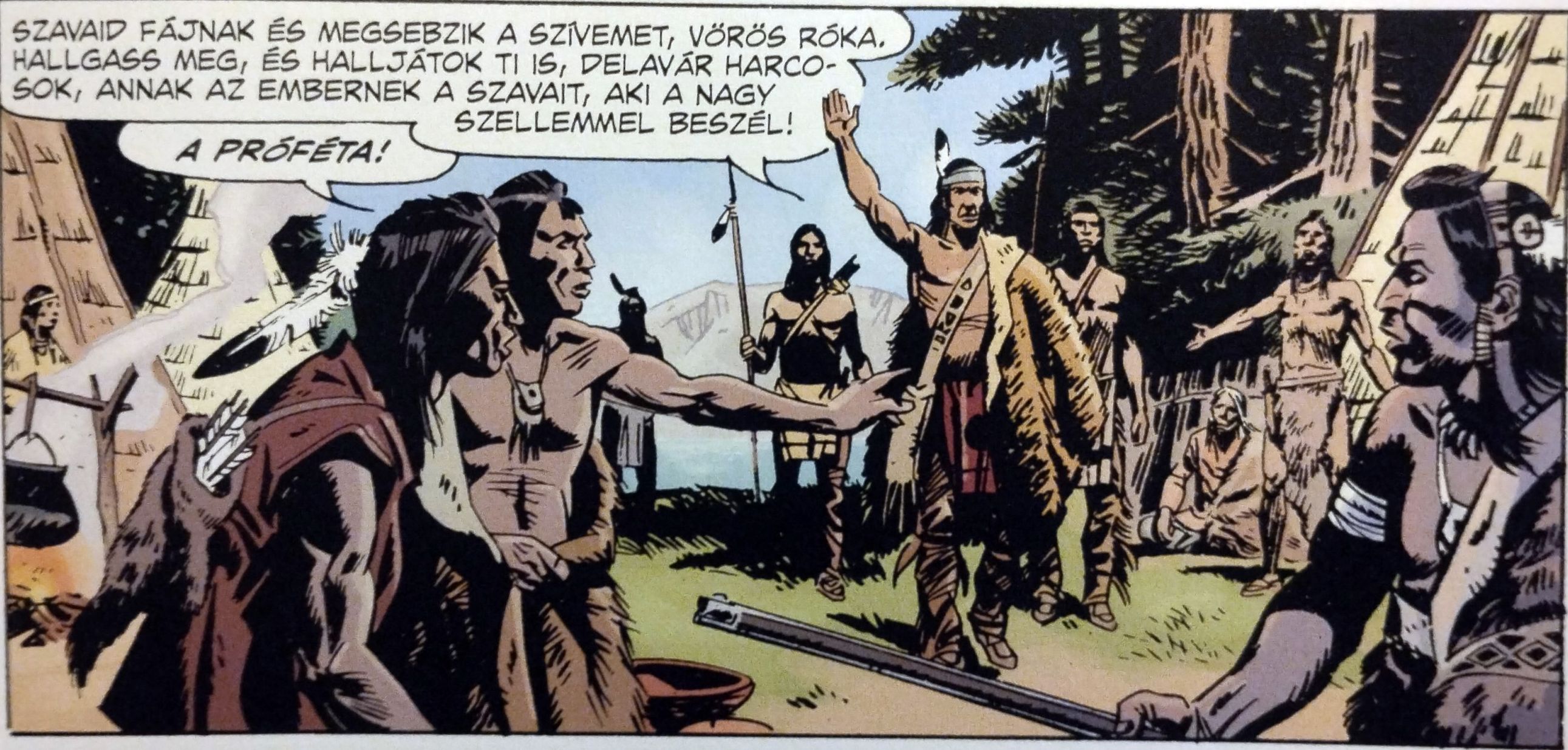 Sőt, nem csupán összehozták őket egy történetben, hanem barátokká is tették. Hol Brett menti meg Tecumseh-et, hol az indián őt, hol az indián Brett családját. De bár találóbb lett volna a nagy indián politikus neve a füzet címének, a történet mégsem róla, hanem elsősorban Brettről szól. S rajta keresztül Amerikáról. Aminek szerves része volt a sóni törzs és annak legendás törzsfőnöke, meg a prófétája is.