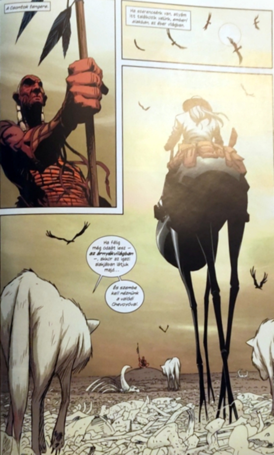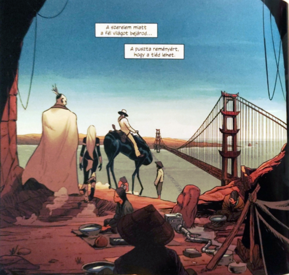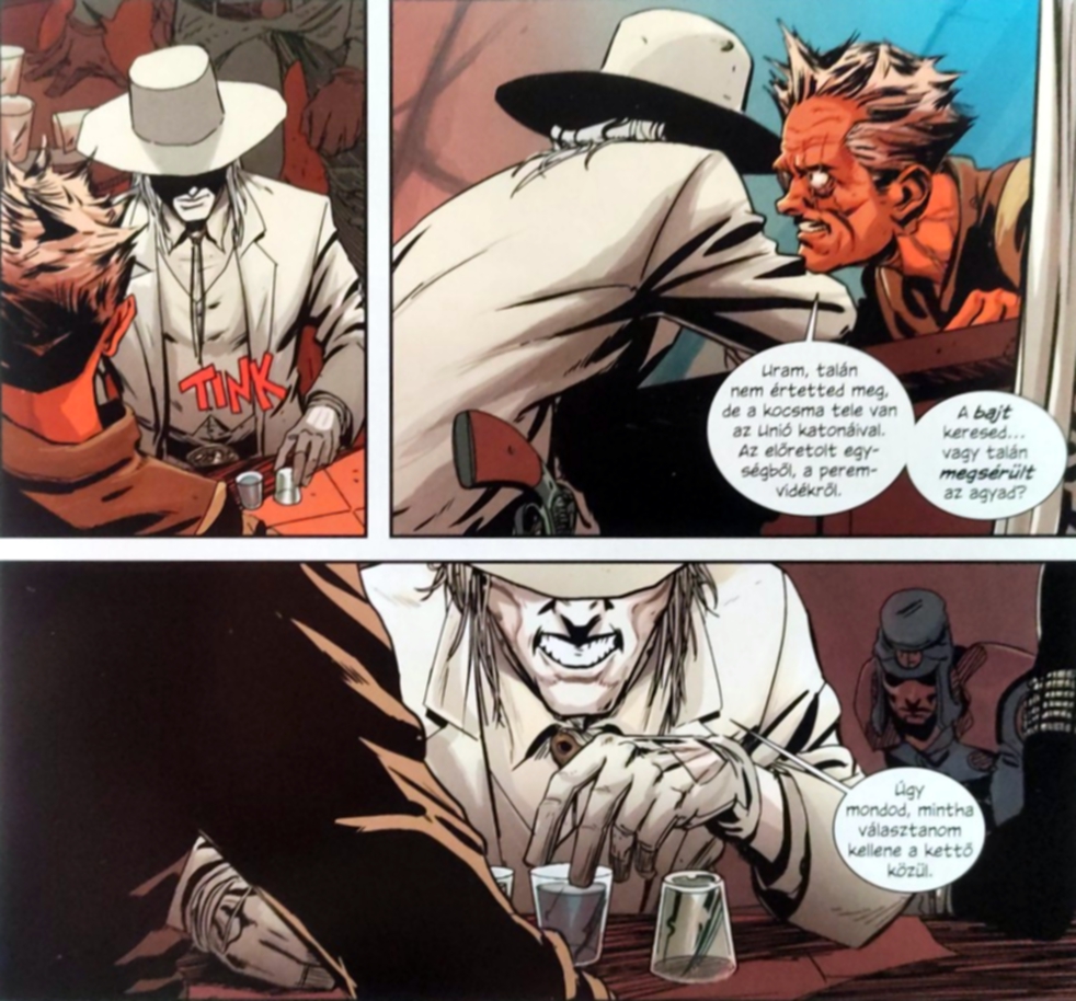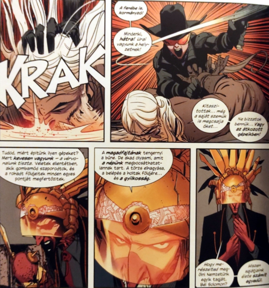 De nem szuperhősös. Igaz nem is teljesen western, amiképpen a nagyon vacakul, semmilyenre sikerült borító sugallja. Hanem bibliai-western-apokaliptikus-horror-disztópia, rengeteg, vastagon fröccsenő vérrel, szürrealisztikus, horror-alakkal. Meg egy szerteszéjjel hullott Egyesült Államokkal.