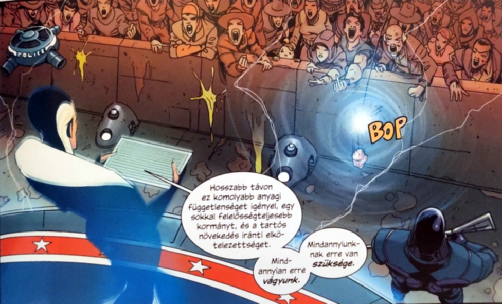 Egy kicsit súgok. Bammeg, a kötet végén, tehát amikor átrágtad magadat mindenen, és már fáj a nyakad, úgy kapkodtad a fejedet, egyszerre a szemed elé tárul legalább az a nyolc ország, mivé Amerika hullott. Mármint úgy, hogy mindegyik kap két-két oldalt, hogy megtudj róluk ezt-azt. A legvégén meg kapsz hét oldal idővonalat, hogy mikor melyik országrésszel mi történt. Ööö... khm... mi fog történni... vagy mi a franc... Mondjuk ez a hét oldal idővonal nagyjából ugyanúgy nem mond szinte semmi, ahogyan előtte a rajzolt történet. Mert random kiragadva (hidd el, a 416 oldal után pont ugyanannyit tudok bármiről mint te, akinek fogalma nincsen a 416-ról) ugyan miféle információ, hogy: