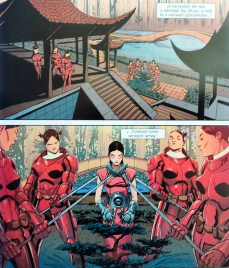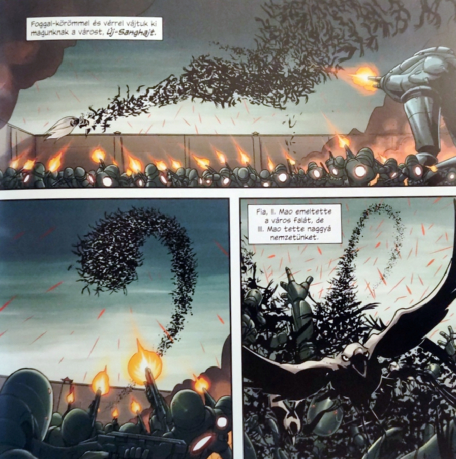 Mert az a csavar az esztétikában, hogy egyáltalán van. Ha a rajzokat nézed, nézzed, önmagukban tök jók. Turmix egyébként még ez is, de ízlésesen kevert katyvasz. Mert, figyeld csak, itt van az Ank. Szocialista állam, a pénzneme jüan, a vezetőjét Xiaolian Mao-nak hívják. Kegyetlen, vérengző nőstény, ő szült fiút a Halálnak, még az apját is simán, saját kezűleg végezte ki a hatalom megragadása érdekében. Nos, van kérdés?