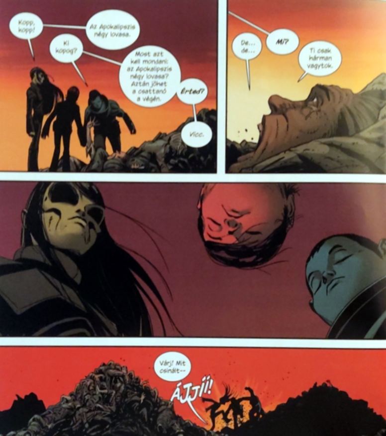 Itt van az apokalipszis négy lovasa. Három ló nélkül. A Halálnak gép a lova, de legalább van. A Háború, Dögvész, Éhinség valamiért gyerekalakban van. Utálja mind, hogy gyerekalakban van. Mind a négynek szerves teste, idegei vannak. A Halálnak ki lehet szedni a szemét, Dögvésznek lézerrel le lehet vágni térdből a lábát, és rohadtul fáj neki. (Mondjuk az fekete humor, hogy amikor Háború rátalál a csonkolt Dögvészre, ezt mondja: „Szia! Hiányzik az egyik lábad!”, mocsok jó. Jó, irdatlanul fekete humor, de akkor is humor. Nem sok van ebben a könyvben.)